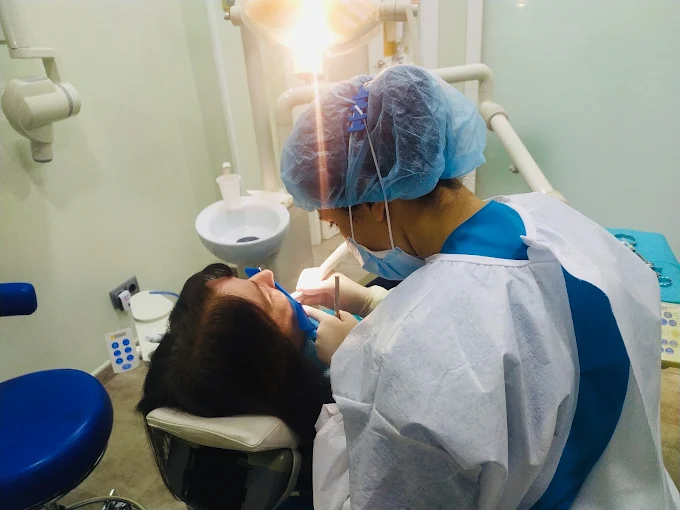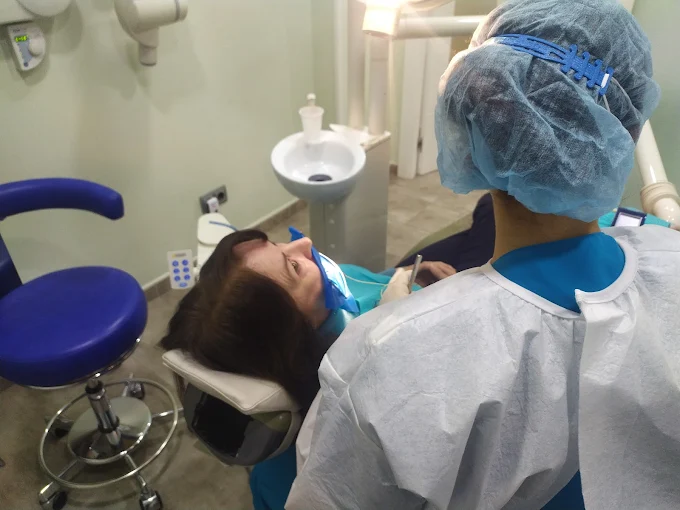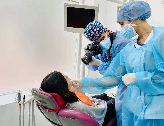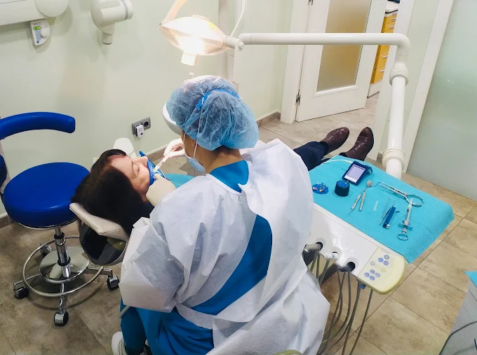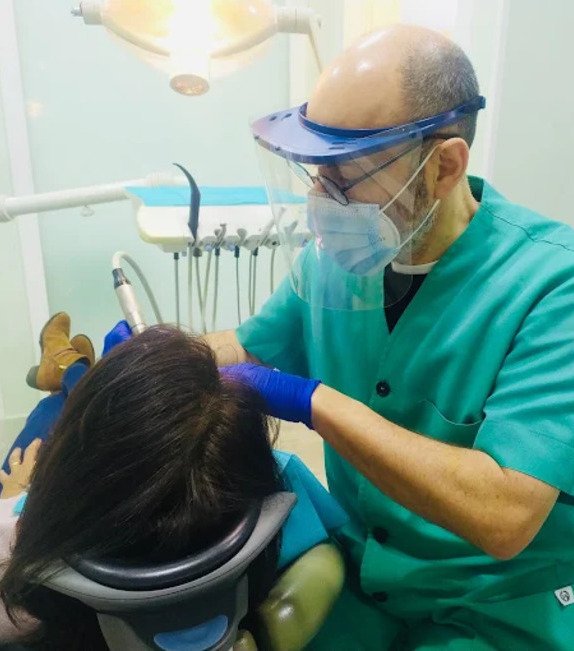 dentista realizando tratamiento a paciente en clinica con proteccion facial